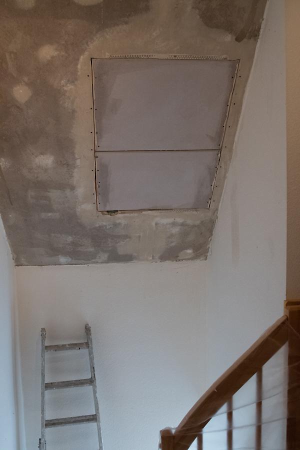 Oben im Treppenhaus war mal ein Fenster, zum Putzen ganz schlecht zu erreichen. Jetzt wurde es ausgebaut, Rigipsplatte rein, gespachtelt, neu tapeziert, Flur und Treppenhaus frisch gestrichen. Super Arbeit von den Leuten unseres Malermeisters Axel Semper!!!