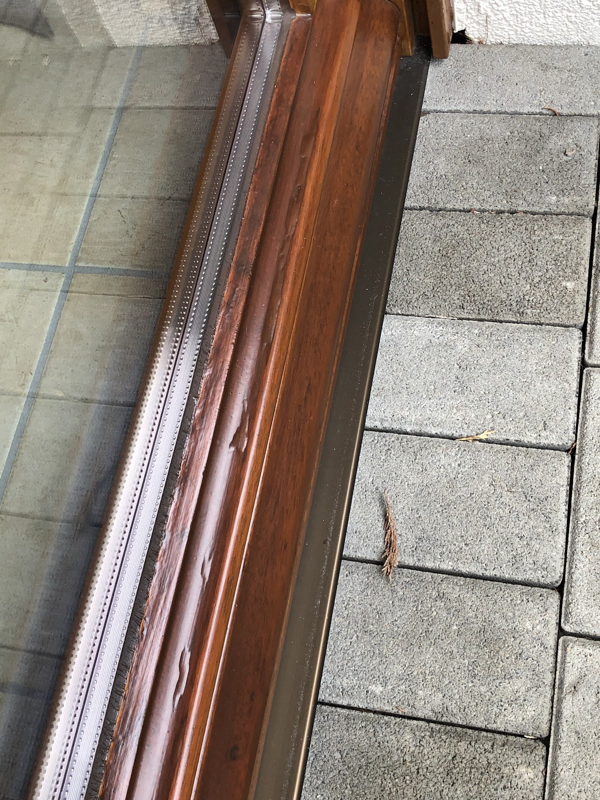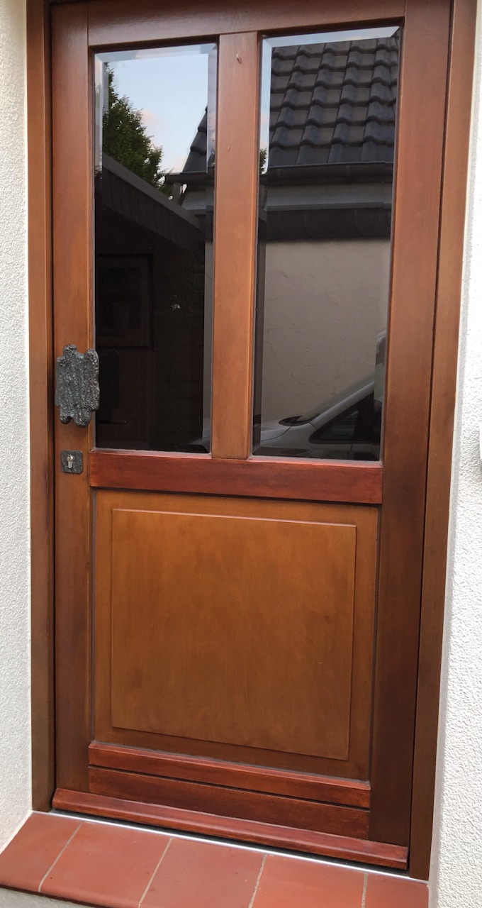 Die Arbeiten, welche an den beiden Haustüren stattfanden sind ebenfalls nicht akzeptabel. Man sieht z.B. bei einer Tür mehrere tiefe Schleifriefen im Holz und die Tür ist nun mehrfarbig. Außerdem wurde nicht sauber gearbeitet. An der Scheibe ist Lasur und man kann erkennen, dass beide Türen vor dem Auftragen der Lasur nicht gereinigt wurden.
