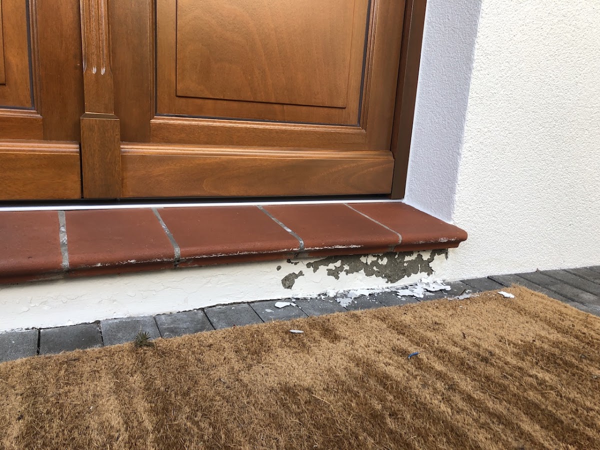 Die Fassade wurde vor 1,5 Jahren in einem hellen Farbton gestrichen, jedoch wurden viele Stellen nahe des Bodens übersehen. Unter den Haustüren platzte die Farbe nach kurzer Zeit ab und es befinden sich mehrere Farbkleckse auf dem Boden und auf den Fensterbänken.