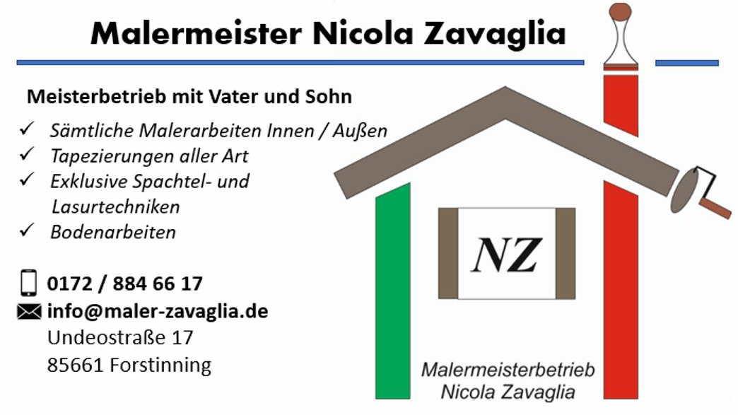 Wir haben gerade unser Haus vollständig saniert. Wir hatten das Glück mit Hr. Zavaglia einen sehr kompetenten und freundlichen Malermeister gefunden zu haben. Er und sein Team hat unser Bauvorhaben begleitet und alle Arbeiten zu unserer vollsten Zufriedenheit erledigt. Das ist in der heutigen Zeit nicht mehr selbstverständlich. Das Verhältnis zu Preis und Leistung ist top. Wir können den Malermeister Zavaglia uneingeschränkt weiterempfehlen.