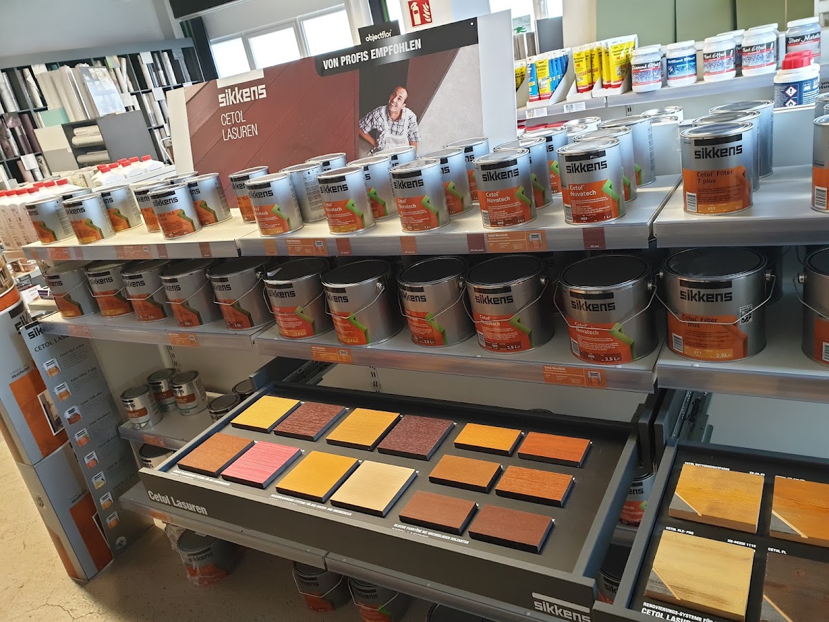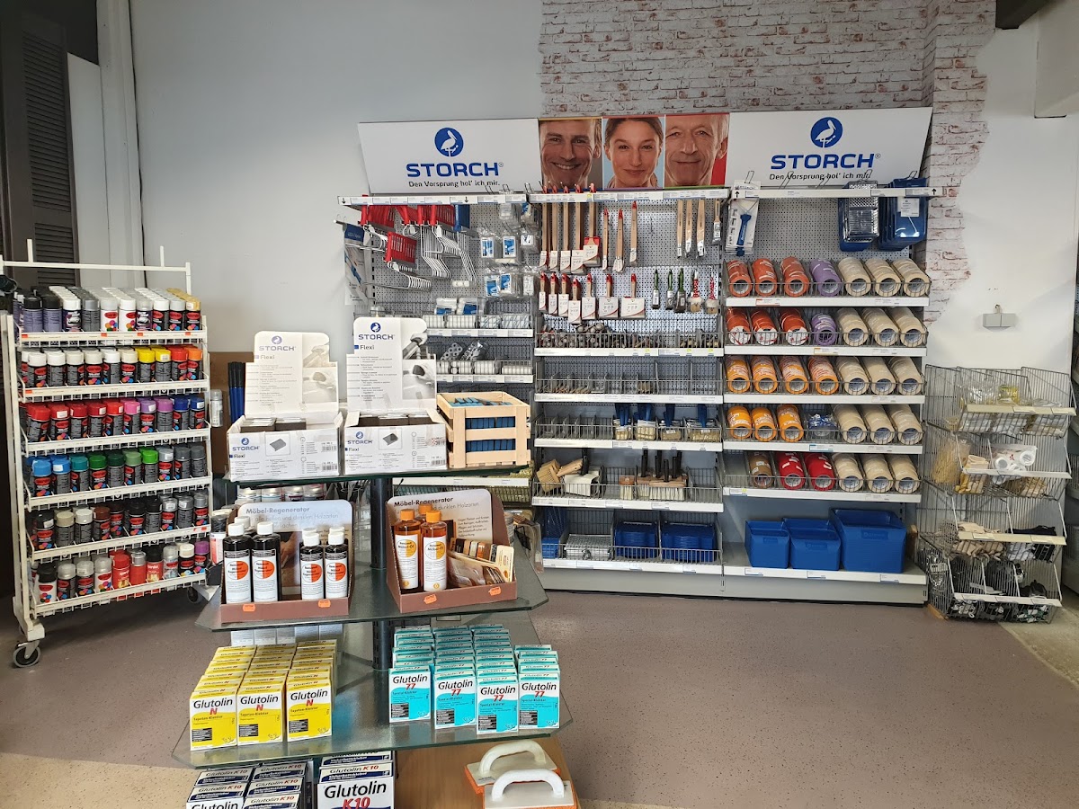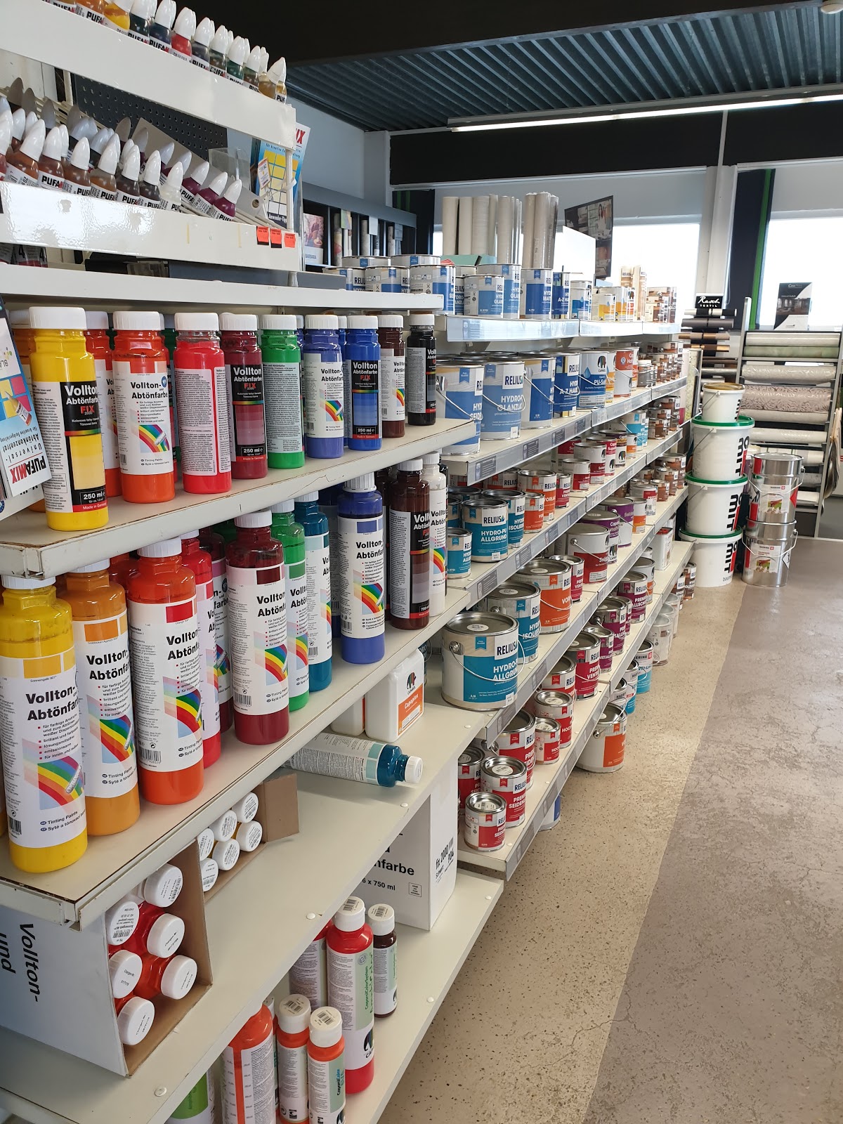 Große Auswahl an Farben und Lacken. Werkzeuge und weiteres Material vorhanden. Parkplätze vorhanden.