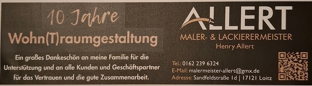 Ich würde Herrn Allert jedem empfehlen der einen guten und zuverlässigen Maler sucht. Er leistet sehr präzise und saubere Arbeit. Zudem wurde ich super beraten und habe jetzt ein wunderschönes Wohnzimmer mit passenden Boden zu angemessen Preisen bekommen.