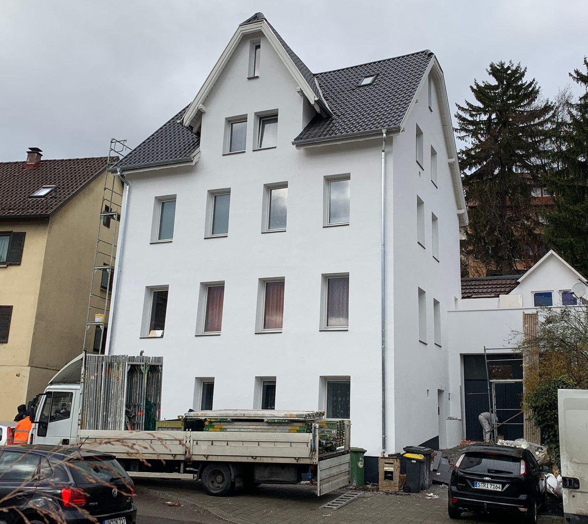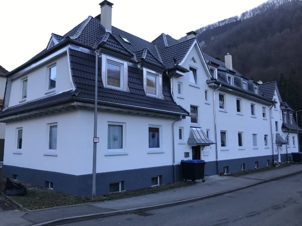 Es wurde eine komplette Fassadendämmung (Mineralwolle/Resol-Schaumplatten) inkl. neuer Fensterbänke (Granit) und Dachrinnenanschlüsse erstellt.