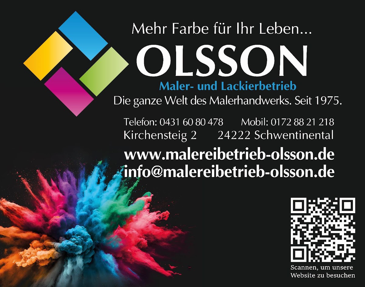 Firma Olsson war in den letzten 4 Monaten zweimal für größere Projekte bei uns im Haus tätig. Trockenbau (Zimmerdecken), Türeinbau, Fussbodenbeläge und natürlich Maler- und Tapezierarbeiten. Alle Arbeiten wurden zu unserer vollsten Zufriedenheit ausgeführt. Herr Olsson und seine Mitarbeiter arbeiten sehr sauber, zuverlässig und sind immer pünktlich gewesen. Die Absprachen wurden eingehalten und die Kommunikation lief immer hervorragend. Malereibetrieb Olsson hat uns mit Kompetenz und guten Ideen sehr bei der Entscheidungsfindung geholfen. Sehr gutes Preis- Leistungsverhältnis!!! Bei uns kommt nur noch Firma Olsson ins Haus! Vielen Dank an das gesamte Team!