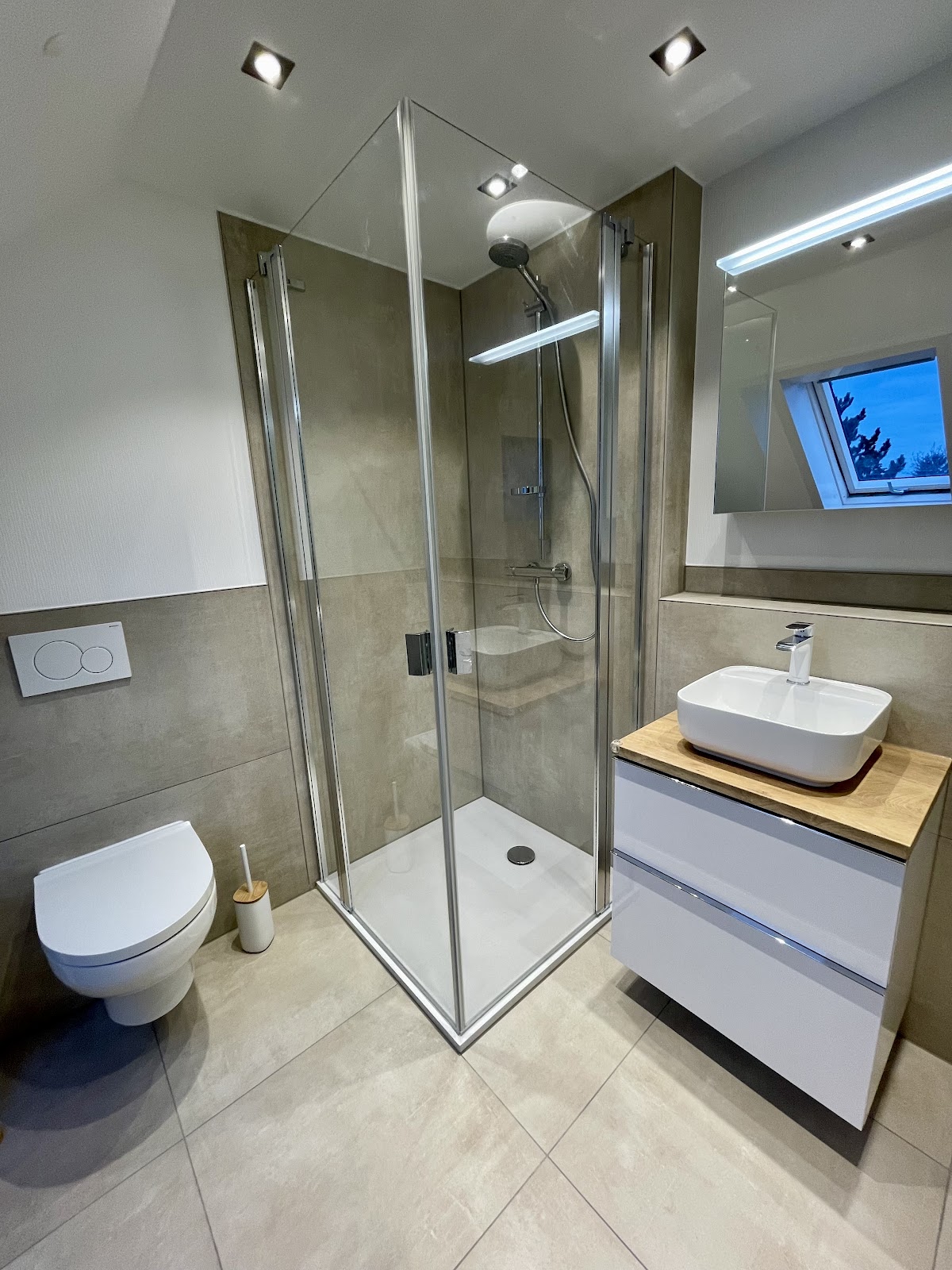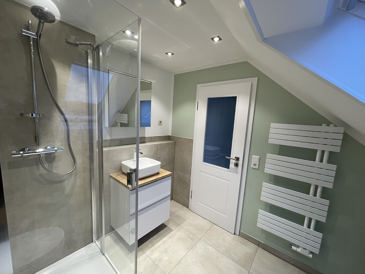 Ferner wurde das komplette Bad im EG neugestaltet und umgebaut. Sämtliche Fliesen-, Putz- und Malerarbeiten wurden perfekt umgesetzt, insbesondere das Verputzen einzelner Wände mit Edelputz unter Anwendung einer speziellen Malertechnik.
