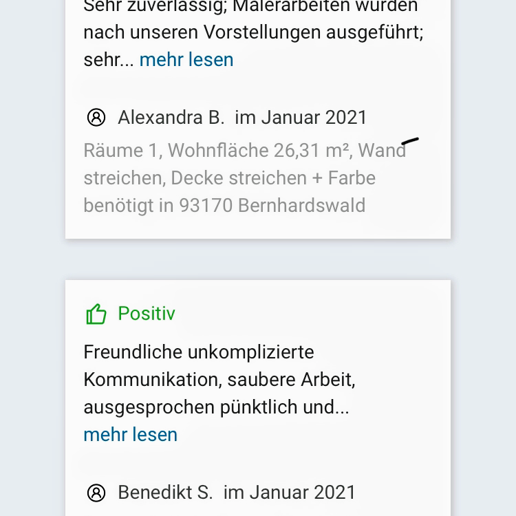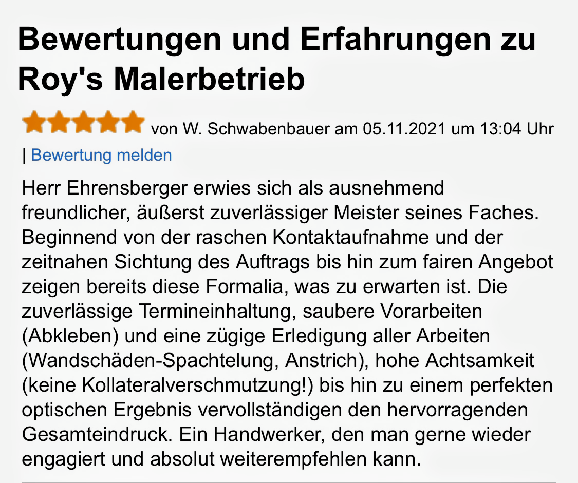 Wenn Sie auf der Suche nach einem zuverlässigen und kompetenten Malerbetrieb sind, sind Sie bei "Roy" in den besten Händen. Wir werden definitiv wieder ihre Dienste in Anspruch nehmen und können Sie uneingeschränkt weiterempfehlen.